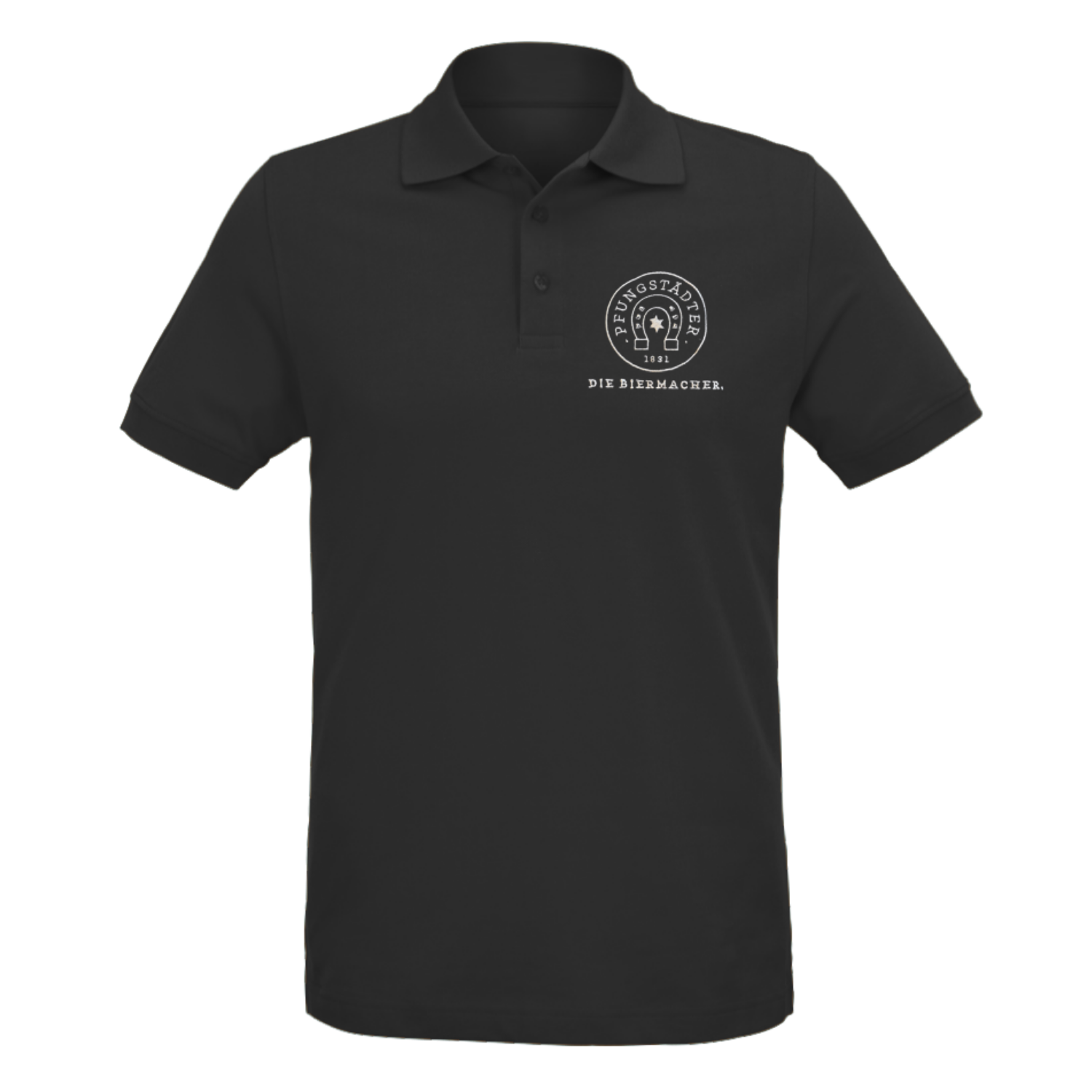 Klassisch geschnittenes Polo-Shirt in schwarz mit Pfungstädter Rundlogo auf der linken Brustseite (Stick: silber).